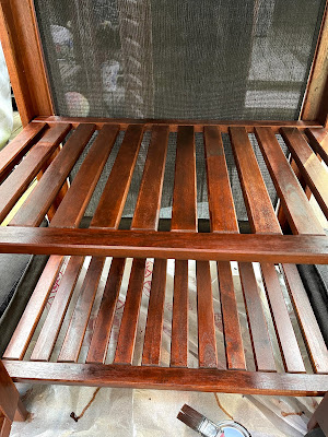 Utemöblerna behöver tas hand om, så jag målar med lasyr på Ikea skåpen som